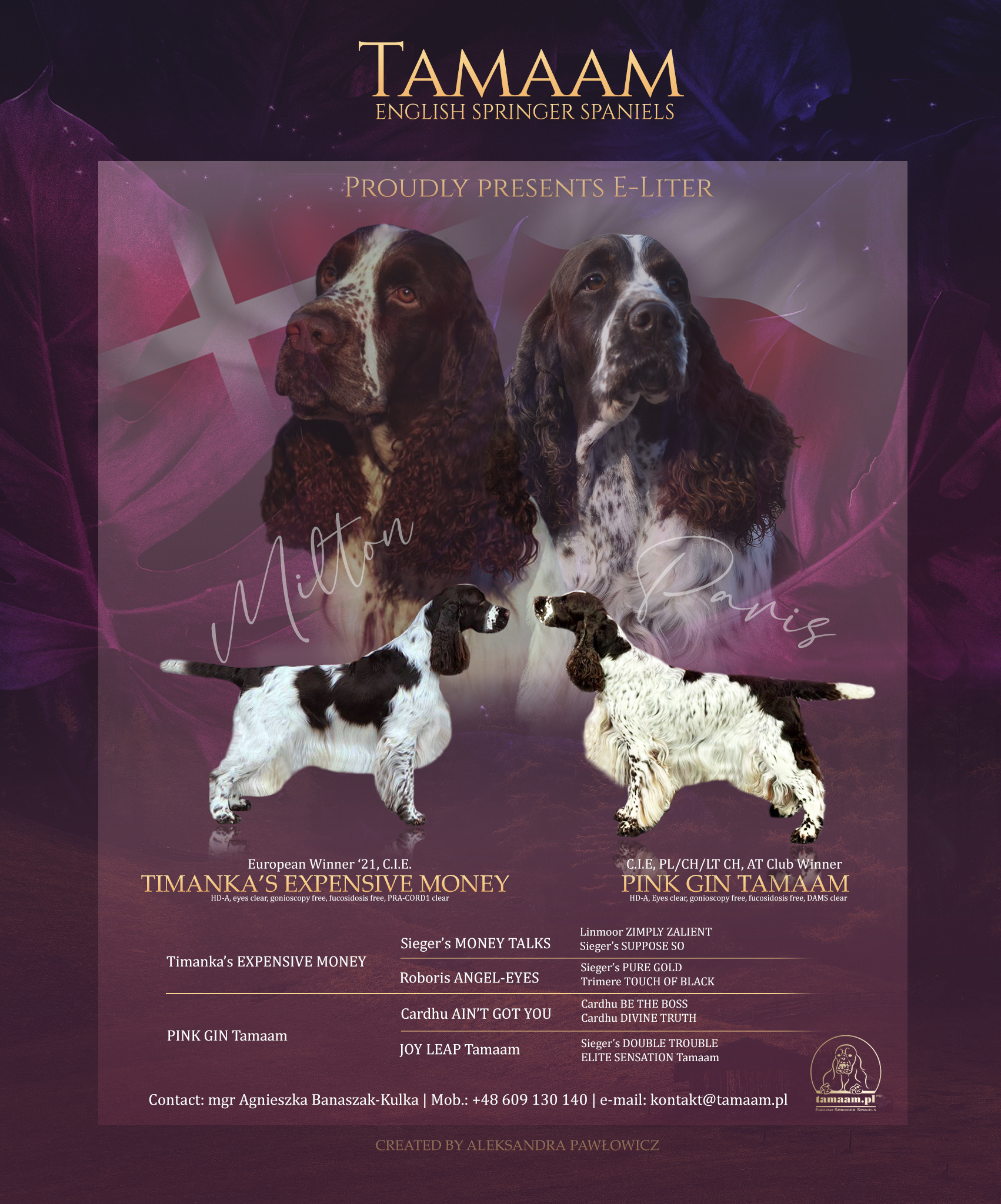 Rodzice są wybitnymi, utytułowanymi reprezentantami rasy, mającymi na koncie wiele wystawowych triumfów.