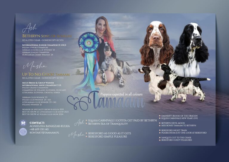Hodowla TAMAAM została zarejestrowana w FCI 15 października 2003r. W ciągu dziewiętnastu lat jej istnienia 40 tamaamkowych piegusów uzyskało tytuły Championów. Wyhodowaliśmy również 15 Interchampionów/ Międzynarodowych Championów Wystawowych C.I.E i C.I.B. Jednym z najważniejszych momentów naszej pracy hodowlanej pozostaje przyznanie w 2014 roku tytułu Championa Wielkiej Brytanii psu urodzonemu w naszej hodowli – jako pierwszemu i JEDYNEMU springer springerowi angielskiemu w historii rasy w Polsce.